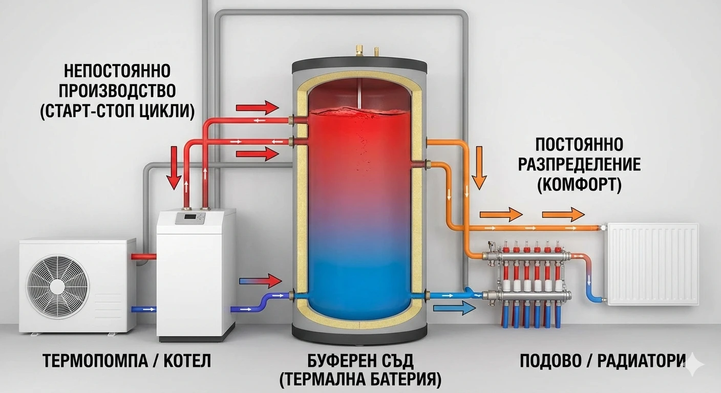 Това е добре изолиран резервоар, пълен с вода, който се монтира между източника на топлина (термопомпа/котел) и отоплителните тела (подово/радиатори). Неговата роля е да акумулира (складира) произведената топлина и да я подава към къщата тогава, когато е необходимо.